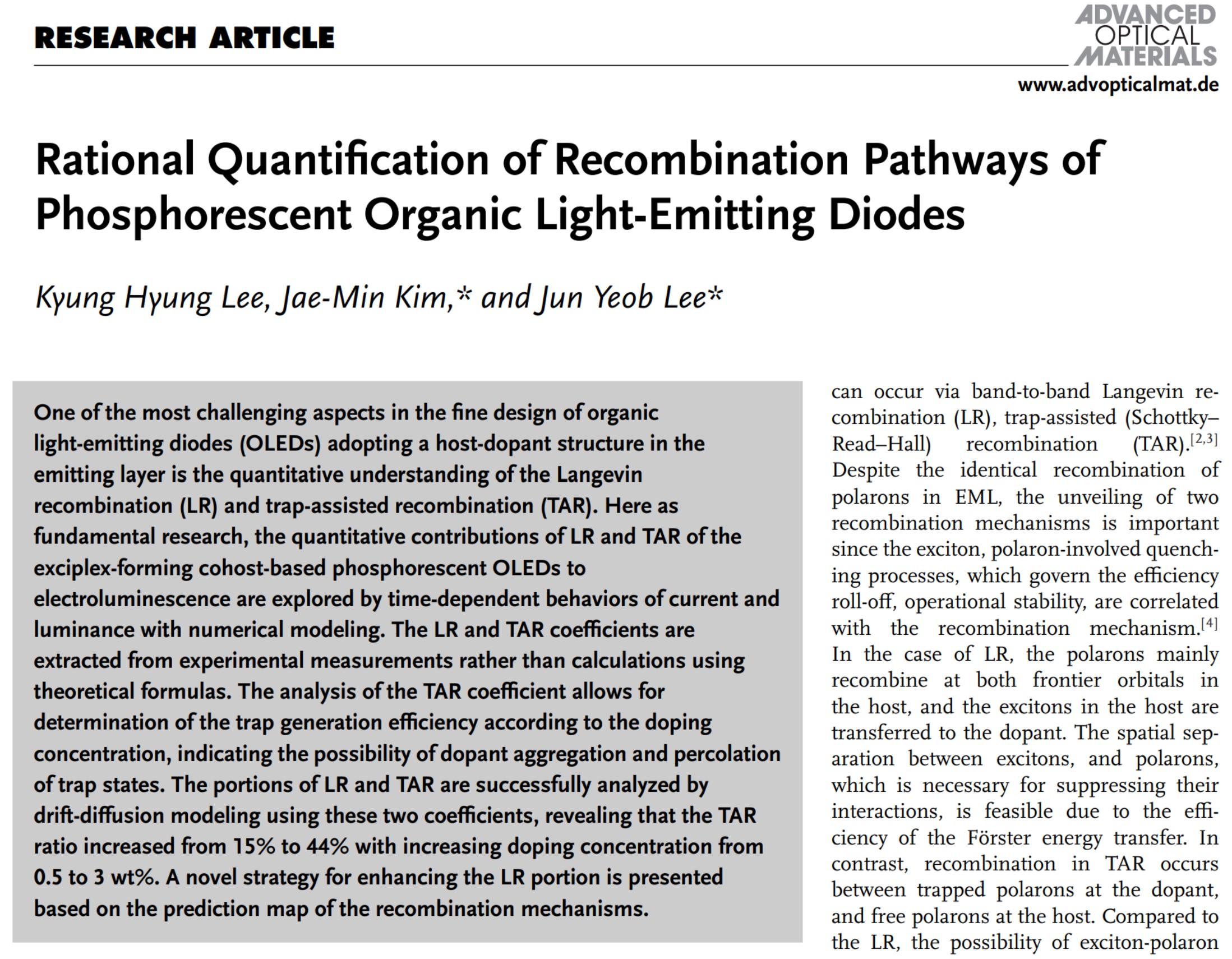 이경형 연구원 (박사과정)의 논문이 Advanced Optical Materials에 게재되었습니다. 축하합니다! Rational Quantification of Recombination Pathways of Phosphorescent Organic Light-Emitting Diodes Kyung Hyung Lee, Jae-Min Kim*, and Jun Yeob Lee* Advanced Optical Materials (IF=9.0 / JCR ranking 9.5%) |