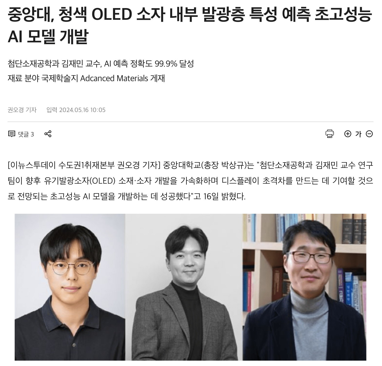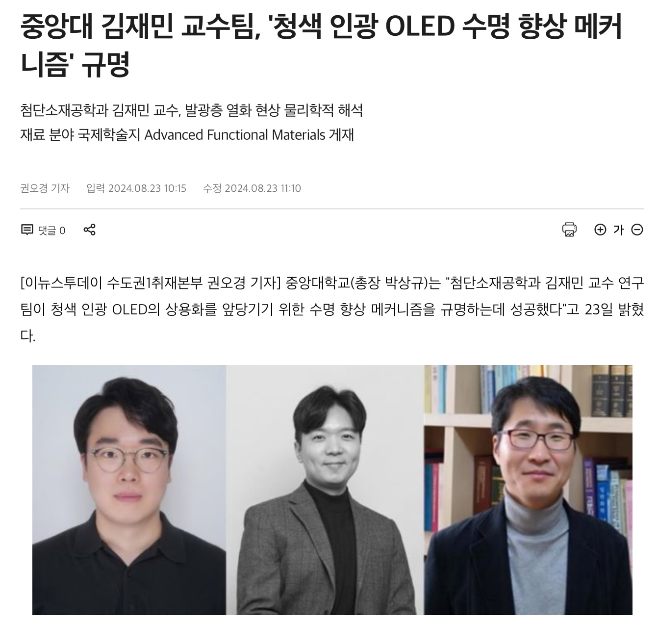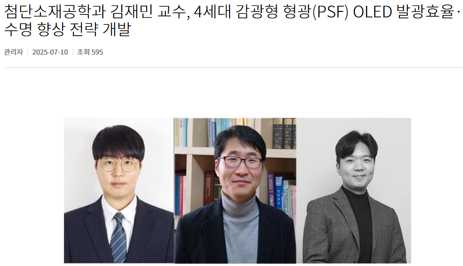 이경형 연구원의 연구가 CAU News와 언론에 보도되었습니다. Kyung Hyung Lee’s work was reported in the press and CAU News! [중앙대 김재민 교수팀, ‘청색 인광 OLED 수명 향상 메커니즘’ 규명] Role of tailoring exciplex-forming cohosts in the longevity of blue phosphorescent organic light-emitting diodes CAU News / 스마트경제 / E동아 / 한국대학신문 / 이뉴스투데이 / 베리타스알파 / 와이드경제 / 뉴시스 / 매일일보 / 대학저널 / 뉴스프리존 |
