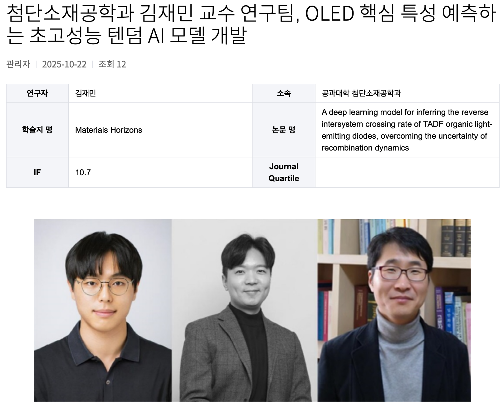 | 임준섭 연구원 (박사과정)의 연구가 CAU News와 언론에 보도되었습니다. Junseop Lim’s work was reported in the press and CAU News! [중앙대-성균관대 공동연구팀, 청색 OLED 소자 내부 발광층 특성 예측 초고성능 AI 모델 개발] Prediction of triplet harvesting ability in blue fluorescent organic light-emitting diodes using deep learning |