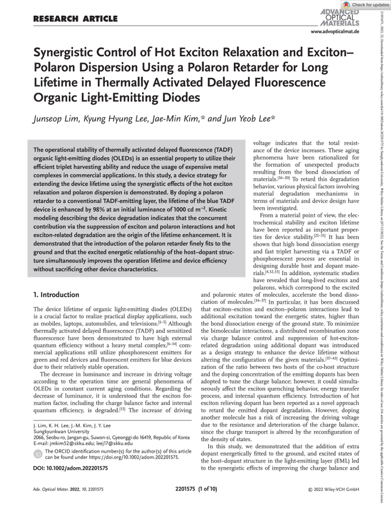Synergistic control of hot exciton relaxation and exciton–polaron dispersion using a polaron retarder for long lifetime in thermally activated delayed fluorescent organic light-emitting diodesJunseop Lim, Kyung Hyung Lee, Jae-Min Kim*, and Jun Yeob Lee*Advanced Optical Materials, 10, 2201575 (2022) (Impact Factor: 10.050 / JCR Top 8.42%) |