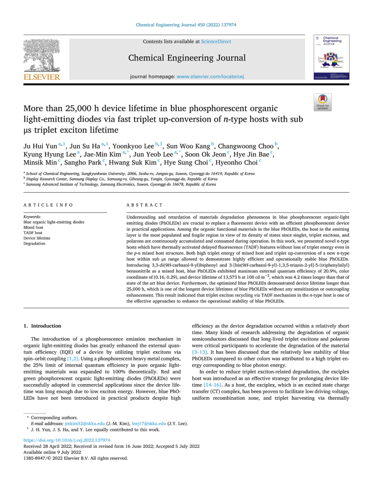 More than 25,000 h device lifetime in blue phosphorescent organic light-emitting diodes via fast triplet up-conversion of n-type hosts with sub μs triplet exciton lifetime Ju Hui Yun†, Jun Su Ha†, Yoonkyoo Lee†, Changwoong Choo, Kyung Hyung Lee, Jae-Min Kim*, Jun Yeob Lee*, Soon Ok Jeon, Hye Jin Bae, Minsik Min, Sangho Park, Hwang Suk Kim, Hye Sung Choi, Hyeonho ChoiChemical Engineering Journal, 450, 137974 (2022) (Impact Factor: 16.744 / JCR Top 2.46%) |