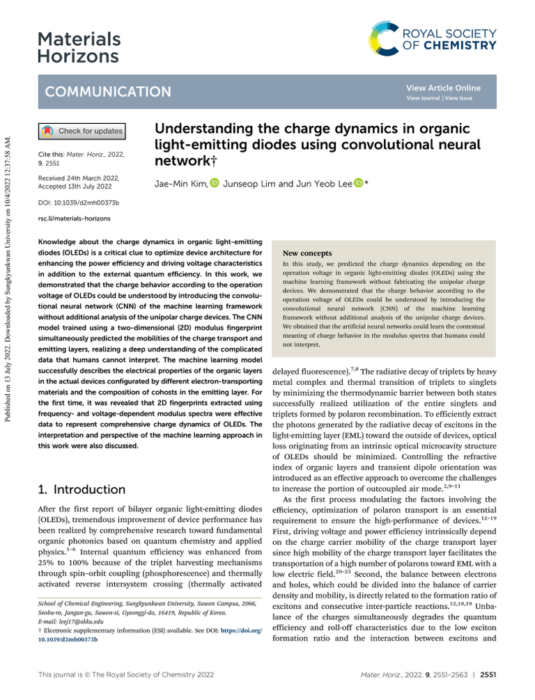 Understanding the charge dynamics in organic light-emitting diodes using convolutional neural networkJae-Min Kim, Junseop Lim, and Jun Yeob Lee*Materials Horizons, 9, 2551 (2022) (Impact Factor: 15.717 / JCR Top 6.52%) https://doi.org/10.1039/d2mh00373b (Link) (View) |