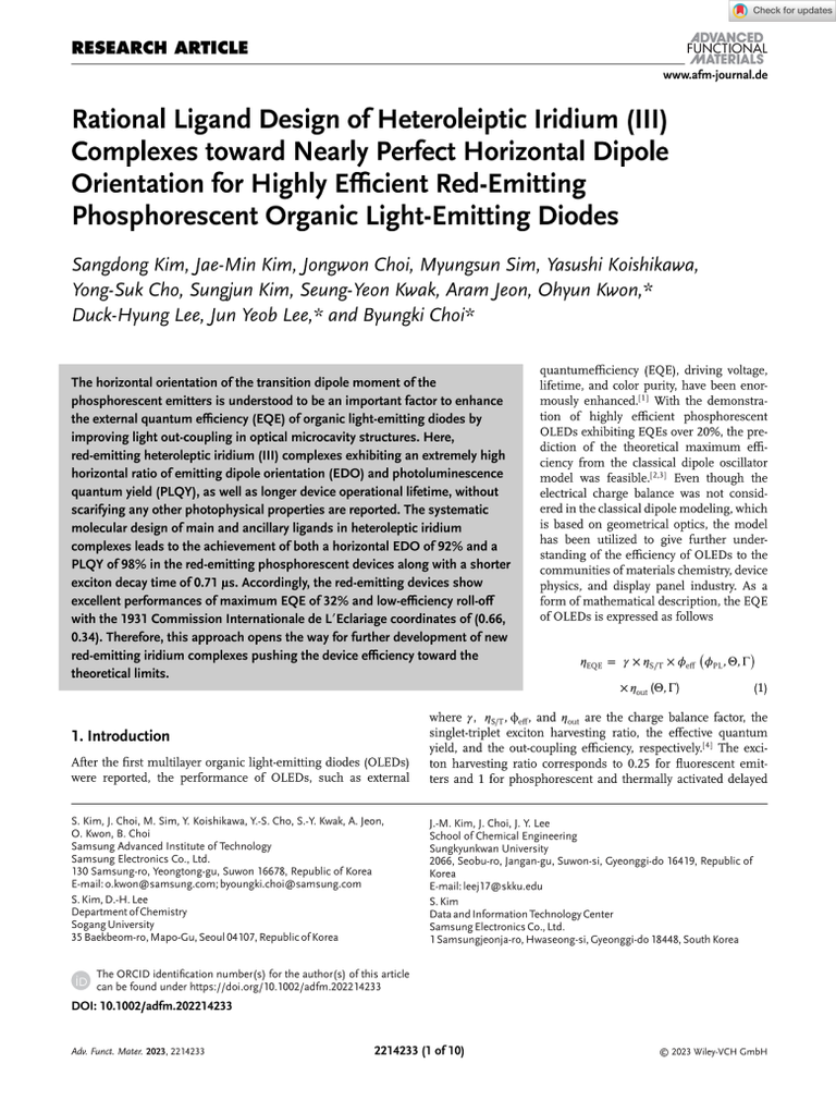 Rational Ligand Design of Heteroleiptic Iridium (III) Complexes toward Nearly Perfect Horizontal Dipole Orientation for Highly Efficient Red-Emitting Phosphorescent Organic Light-Emitting DiodesSangdong Kim+, Jae-Min Kim+, Jongwon Choi+, Myungsun Sim, Yasushi Koishikawa, Yong-Suk Cho, Sungjun Kim, Seung-Yeon Kwak, Aram Jeon, Ohyun Kwon,* Duck-Hyung Lee, Jun Yeob Lee,* and Byungki Choi*Advanced Functional Materials, 2214233 (2023) (Impact Factor: 19.0 / JCR Top 4.2%) |