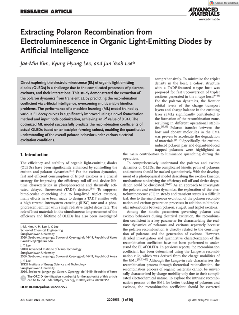 Extracting polaron recombination from electroluminescence in organic light-emitting diodes by artificial intelligenceJae-Min Kim, Kyung Hyung Lee, and Jun Yeob Lee*Advanced Materials, 35, 2209953 (2023) (Impact Factor: 32.086 / JCR Top 2.12%) |