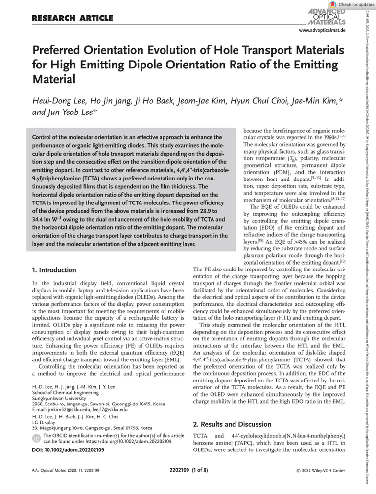 Preferred orientation evolution of hole transport materials for high emitting dipole orientation ratio of the emitting material Heui-Dong Lee, Ho Jin Jang, Ji Ho Baek, Jeom-Jae Kim, Hyun Chul Choi, Jae-Min Kim* and Jun Yeob Lee*Advanced Optical Materials, 11, 2202109 (2023) (Impact Factor: 10.050 / JCR Top 8.42%) |