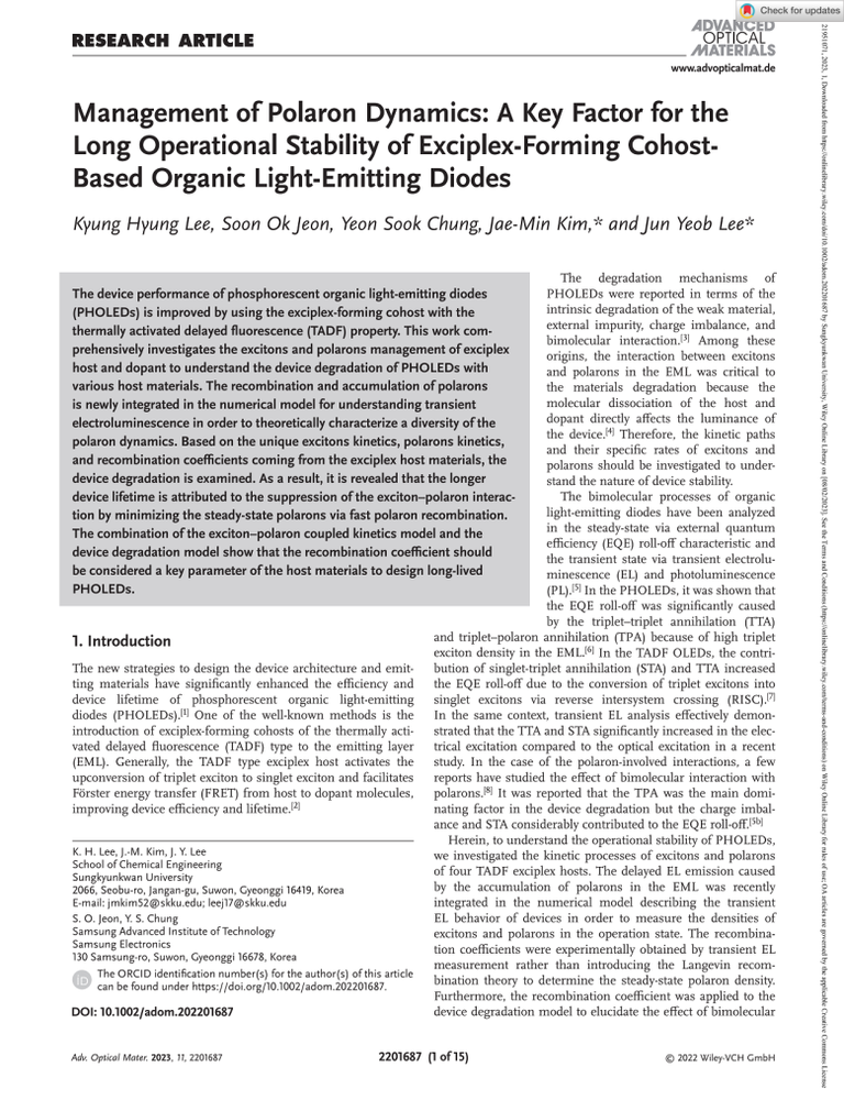 Management of polaron dynamics: a key factor for the long operational stability of exciplex-forming cohost-based organic light-emitting diodesKyung Hyung Lee+, Soon Ok Jeon+, Yeon Sook Chung, Jae-Min Kim*, and Jun Yeob Lee*Advanced Optical Materials, 11, 2201687 (2023) (Impact Factor: 10.050 / JCR Top 8.42%) |