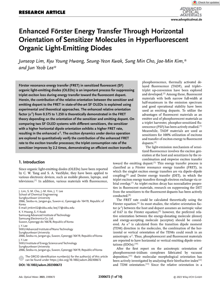 Enhanced Förster Energy Transfer Through Horizontal Orientation of Sensitizer Molecules in Hyperfluorescent Organic Light-Emitting DiodesJunseop Lim, Kyu Young Hwang, Seung-Yeon Kwak, Sung Min Cho, Jae-Min Kim,* and Jun Yeob Lee*Advanced Optical Materials, 11, 2300672 (2023) (Impact Factor: 10.050 / JCR Top 8.42%) |