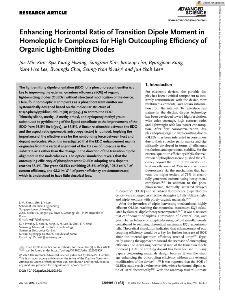 Enhancing horizontal ratio of transition dipole moment in homoleptic Ir complexes for high outcoupling efficiency of organic light-emitting diodesJae-Min Kim+, Kyu Young Hwang+, Sungmin Kim+, Junseop Lim+, Byungjoon Kang, Kum Hee Lee, Byoungki Choi, Seung-Yeon Kwak*, Jun Yeob Lee*Advanced Science, 9, 2203903 (2022) (Impact Factor: 17.521 / JCR Top 5.94%) |