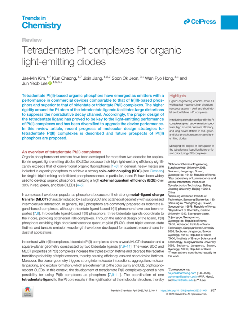 Tetradentate Pt complexes for organic light-emitting diodes Jae-Min Kim+, Kiun Cheong+, Jixin Jiang+, Soon Ok Jeon*, Wang Pyo Hong*, and Jun Yeob Lee*Trends in Chemistry, 5, 4, 267 (2023) (Impact Factor: 22.448 / JCR Top 4.75%) |